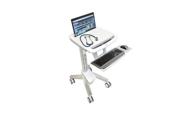 This lightweight, truly ergonomic healthcare cart moves easily throughout the healthcare facility for convenient documentation. It features sit-to-stand height adjustment and an adjustable keyboard tray.