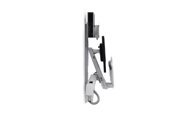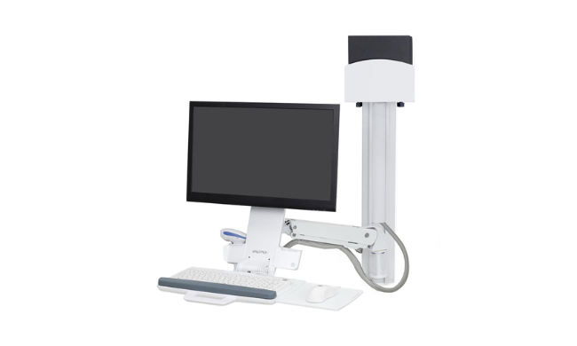 Let caregivers in your healthcare organization work sitting or standing with everything they need at their fingertips. This sit-stand combo system holds a monitor, barcode scanner, CPU, keyboard, wrist rest and mouse, all on the same height-adjustable arm for an ergonomic fit that supports the best workflows (and comfort).